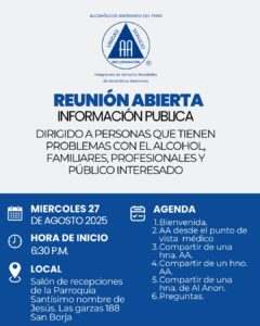 Reunión abierta para público en general, información sobre el alcoholismo, lo que hace y no hace Alcohólicos Anónimos.